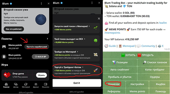 Для начала вспомним, что MP-поинты дают за торговый объем. 1. Переходим в приложение BLUM: https://t.me/blum/app?startapp=ref_D8H35RjGNE 2. Нажимаем на кнопку Торгуй и зарабатывай. 3. Выбираем вариант Торгуй с Трейдинг-ботом. Этот вариант дает самое большое количество MP-поинтов за наименьшие действия. 4. После выбираем кнопку Кошелек. 5. Выбираем TON wallet и после копируем адрес кошелька. Пополнить этот кошелек можно разными способами. Самый удобный, через биржи. Одна из самых любимых бирж OKX - https://okx.com/join/33522424 6. Далее выбираем список токенов, токены TON. Я торгую токеном PX, на данный момент он наименее волатильный. 7. Выбрали токен и переходим к настройкам покупки. Слиппедж на покупку и продажу я поставил 3%. Слиппедж обозначает ситуацию, когда исполнение распоряжения происходит по цене, отличной от указанной в заявке. Реальная цена в этом случае может быть лучше или хуже переданной брокеру. 8. Выставляем количество TON, на которое будем покупать. За 10$ объема