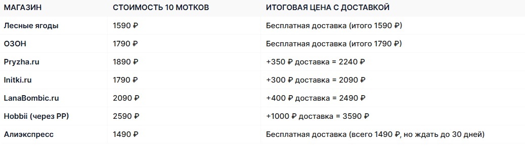 Где купить пряжу, чтобы она была качественной, красивой и недорогой? Этот вопрос рано или поздно возникает у каждой вязальщицы. Чтобы сэкономить ваше время на поиски составлен подробный обзор самых популярных магазинов пряжи, которые порадуют вас широким ассортиментом и приятными ценами. Давайте проанализируем стоимость одного мотка пряжи на примере популярной модели Alize Puffy. Предположим, вам нужно 10 мотков Alize Puffy (100 г): Вывод Надеюсь, эта подробная информация поможет вам сделать правильный выбор! 🧶 Какие магазины пряжи вы предпочитаете? Расскажите в комментариях о своих фаворитах💬