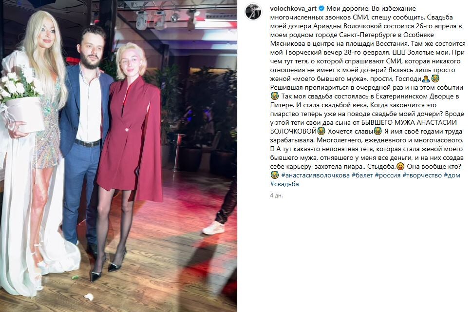 Кстати, Ариадна работает репетитором и продает свои стихи. Жених тоже не из богатых: он поёт в храме и подарил невесте простое кольцо без драгоценных камней. Почему тогда сама Волочкова решила потратить такие сумасшедшие деньги? Может быть, балерина снова в первую очередь беспокоится о себе?