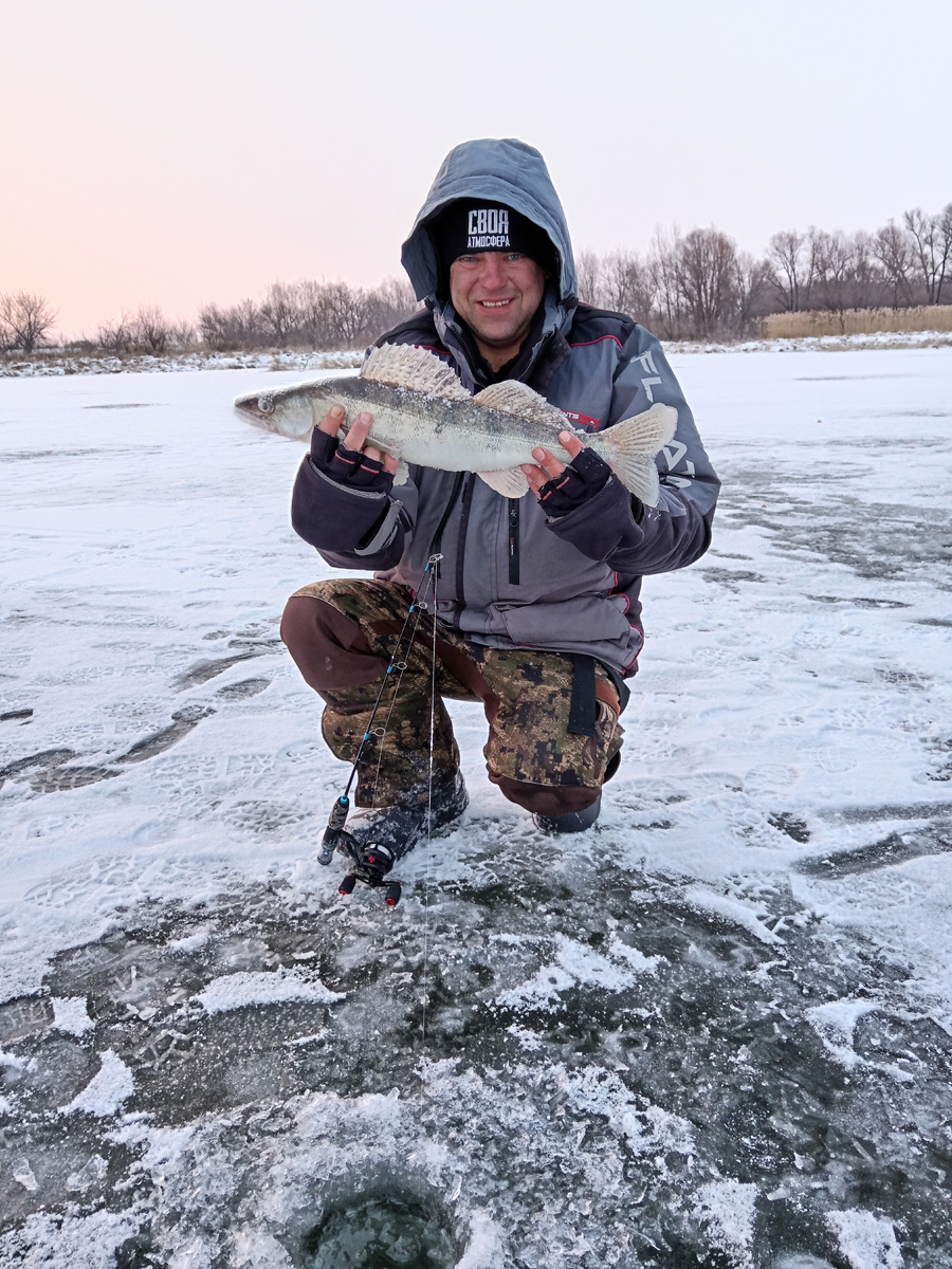 В этот же день 13.02.2025 уезжая с пруда Ивановка, принято решение заехать на Слияние Чёрной Калитвы и Дона. Там лёд есть толстый, хотя удивляюсь как это возможно. Чёрная Калитва без льда и Дон тоже открыт местами. Но на слиянии течение минимальное поэтому так видимо. Сначала ловили окуня, все ловили у меня не получалось. Хотя балансир такой же точно у меня. Потом уже присела и начала смотреть в эхолот. И тут поклевка, но на экране я ничего не увидела, или ничего не поняла. Но окуненок поймался, уже рада я. Через время в этой же лунке ещё одного поймала. Но уже совсем малыша. А после в камеру заметили судака, сменили удилки. Саня первый поймал. Прям практически сразу одного за другим. Первый помельче, а второй уже хороший толстенький. Пузатый. И судак просто повис, нет дерзкой поклевки. А вот 2 года назад это же место. Тоже такие же поклевки были. 👇 А я же тоже хочу. Начала прям следить за Саней как он делает проводку. И повторять за ним. Удача, первый судак есть