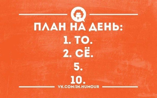 Ну, и основное правило планирования моего дня- всегда оставлять 20% свободного времени, на которое я ничего не планирую. С учётом длительности моего дня ( я встаю в 7, ложусь в 24) на свободное время я оставляю не меньше 3 ч. Почему? Потому что всегда есть мероприятия, которые ты не планируешь, а они вдруг случаются ( неожиданные гости, надо срочно куда-нибудь сходить или съездить и т д)