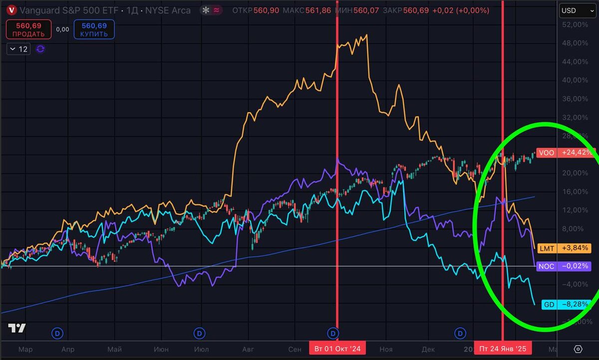 Давайте посмотрим на финансовые потоки, чтобы сделать интересные предположения о будущем! В процессе создания большого аналитического материала для вас я вывел очень занятный график... На графике выше вы наблюдаете динамику четырёх финансовых инструментов: Свечной график — это S&P500, индекс американского рынка. Оранжевая, фиолетовая и голубая линии — это динамика трёх ключевых компаний военного сектора США (Northrop Grumman, Lockheed Martin, General Dynamics). Что же мы видим? Военка показывала бодрую динамику (если отдалить график, это станет ещё очевиднее) последние годы. Но с 1 октября 2024 что-то изменилось (я провёл красную вертикаль с этой датой). Компании начали падать, а Lockheed буквально обвалился. За месяц до избрания Трампа... Замечу, что весь американский рынок в этот период рос, но именно военный сектор падал. Компании ускорили падение против основного тренда. О чём это говорит? Крупный капитал продавал эти акции заранее — перед победой Трампа — и наращивал объёмы прода