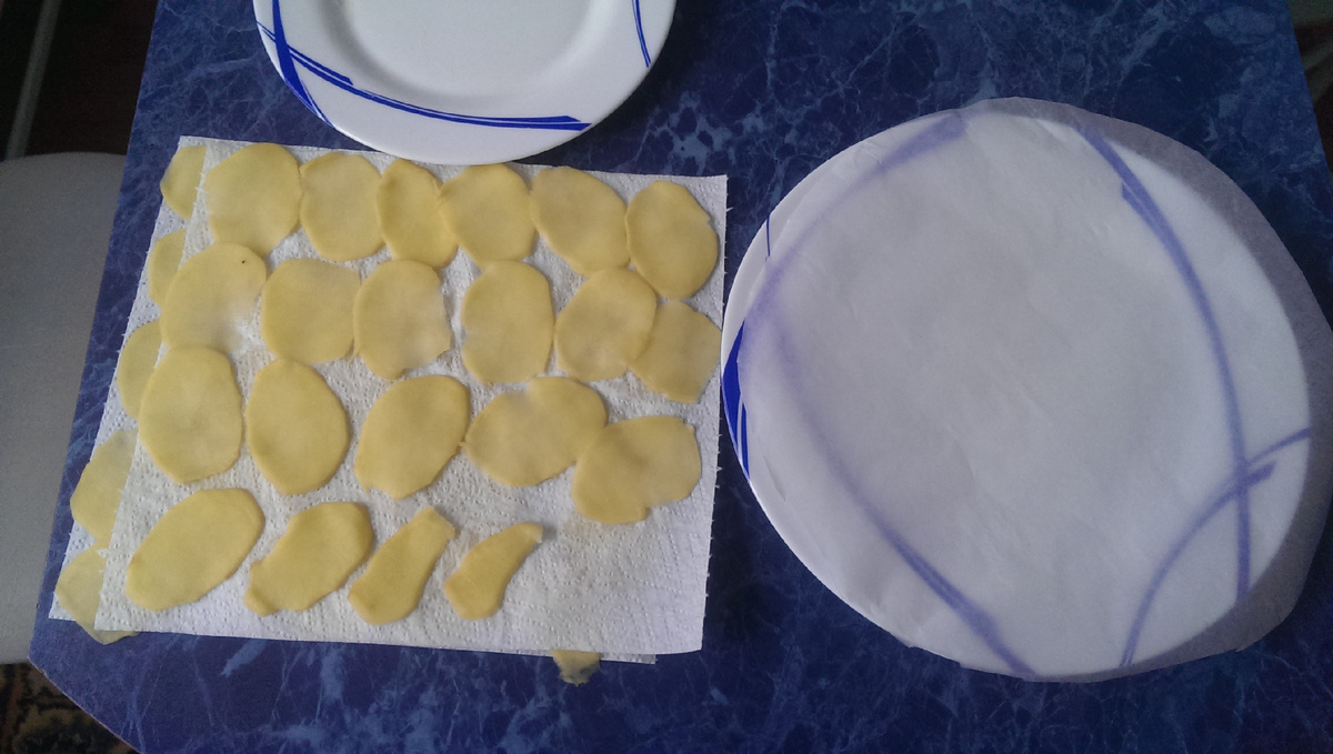 Приветствую подписчиков и гостей канала! Многие наверняка хоть раз покупали чипсы. Кому-то они нравятся и берет до сих пор, кто-то наоборот ругает - куча добавок, химии, ничего полезного. Но согласитесь, иногда очень хочется:) Вот и мне захотелось. Но цена на них последнее время совсем не интересная. Да и посмотрите состав, на самом деле, чего только нет. - А не сделать ли мне их самому, дома?! - подумал я. И сделал. Получилось очень даже вкусно. Быстро и легко. Делаем? Возьмите картофелину среднего размера. Очищаете и нарезаете тонкие слайсы. Я для этого использовал овощечистку. У меня нормальная, прямая. А не бестолковая с режущим полотном поперек рукоятки - терпеть такие не могу, неудобные они. Где-то может быть, но точно не картошку чистить. Нарезанные слайсы промакиваем салфеткой и выкладываем так же на салфетку, а лучше на бумагу для запекания. подсаливаем немного, добавляем любимых специй для аромата и, я еще немного посыпал куркумой. Ну и всё - ставим в СВЧ на 5-10 минут смо