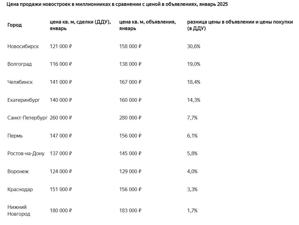 В январе в Волгограде новостройки покупали в среднем на 19% дешевле указанной в объявлении цены. К таким выводам пришли эксперты сервиса «Яндекс Недвижимость» и «Пульс Продаж Новостроек». Они проанализировали стоимость квадратного метра в объявлениях о продаже нового жилья в российских мегаполисах и сравнили ее с ценой при покупке недвижимости. В среднем по городам-миллионникам цена в объявлениях в январе была на 5% выше, чем в реальных сделках. Квартиры по цене существенно ниже, чем в среднем по городу, в январе покупали в Новосибирске, Волгограде, Челябинске и Екатеринбурге — здесь разница между ценой «квадрата» в объявлениях и сделках составляла 14 и более процентов. В Волгограде в январе разница между ценой «квадрата» в объявлениях и сделках составила 19%. Средняя цена квадрата в новостройках в объявлении была указана 138 000 рублей, а по факту во время сделки их приобретали по 116 тысяч. В городе было заключено около 270 договоров долевого участия на приобретение недвижимости обще