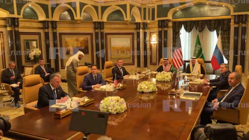 RT показал первые кадры из зала во дворце королевской семьи в Эр-Рияде, где уже начались переговоры представителей России и США. На кадрах видны представители России, США и Саудовской Аравии. Ранее сообщалось, что переговоры российской и американской делегаций начались в Эр-Рияде.