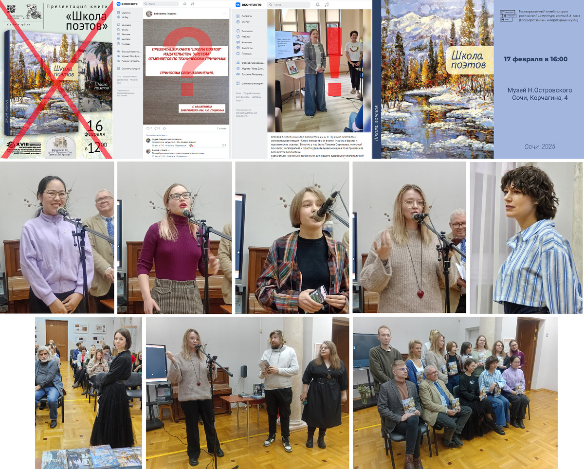 Сомневаюсь, что Александр Сергеевич принял бы мой «юмор», вынесенный в заголовок. Хотя Пушкин века XXI всё может, всё знает и всё понимает. А что тут понимать? Презентацию книги «Школа поэтов» в библиотеке им. А.С. Пушкина отменили «по техническим причинам». Тут же провели увлекательную лекцию «Смех: лекарство от всего? Научные факты и практические советы». А что тут такого? Крыша не обвалилась, свет не вырубили, унитаз в исправности – смеяться можно до уср**ки. А вот читать стихи... Лучше в музее Николая Островского – прозаика со стальным характером. А стальных нервов автору этих строк и не понадобилось. Разве что едва хватило выдержки не выпустить на волю слезы восторга: ПОЭЗИЯ и ЮНОСТЬ – что может быть прекраснее! Небольшой шестой зал (не «Палата №6») был полон семинаристами и мастерами «Школы поэтов» под традиционной опекой Государственного литературного музея им. В.И. Даля в программе XVIII зимнего международного фестиваля искусств в Сочи. Презентация одноименной книги прошел на