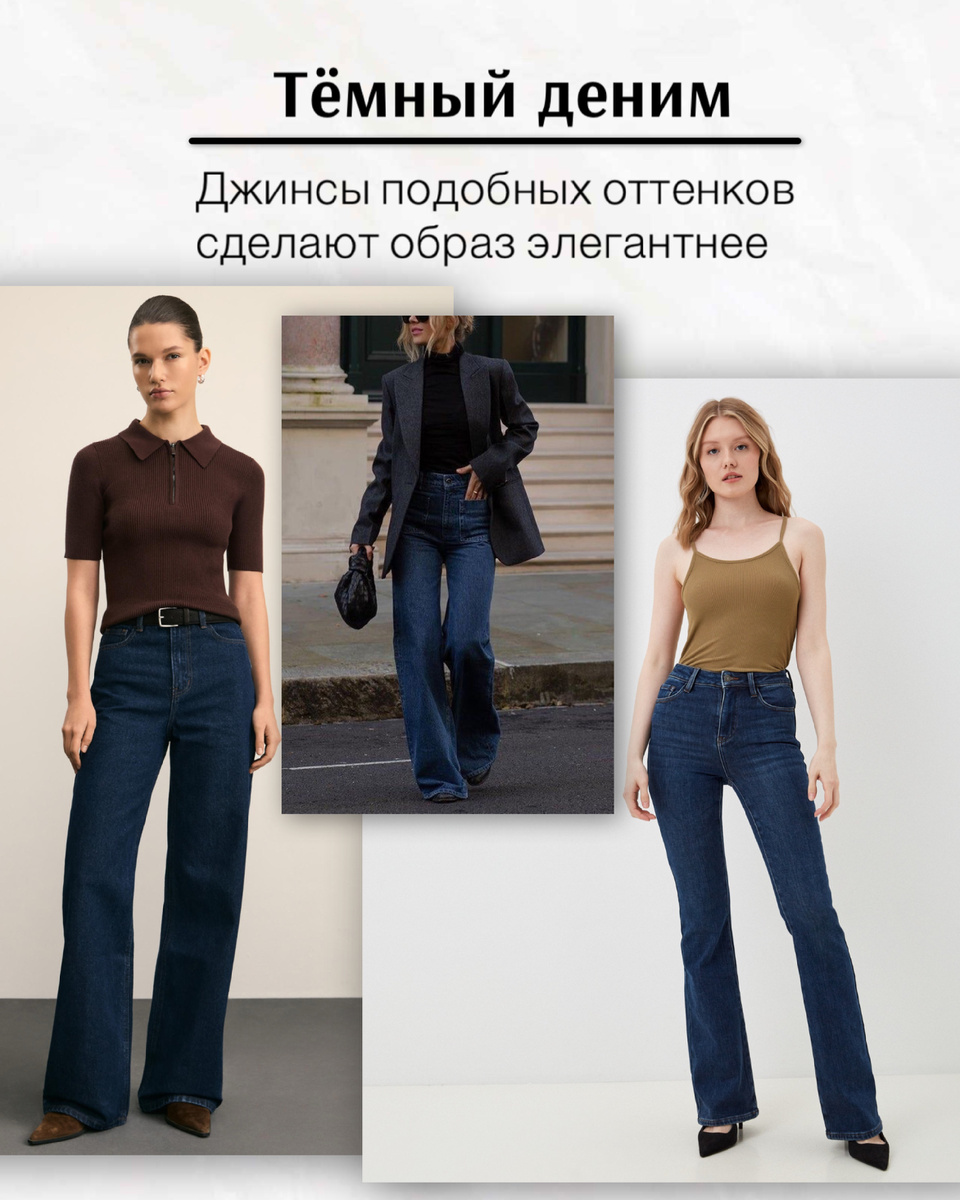 Девушки, привет! Сегодня покажу вам джинсовые тренды этого сезона. Не все они могут вам понравиться, но это нормально — так и должно быть :) Мир моды предлагает новые идеи, а принимать их или пройти мимо — зависит только от ваших вкусов. Помните: тренды необязательны! Без них можно одеваться стильно. Но иногда они привносят в гардероб что-то необычное, что позже становится любимым. На какое-то время этот цвет забыли, но он вернулся — такой глубокий оттенок смотрится благородно и универсально. Попробуйте, ведь: А ещё только представьте, как подобные джинсы смотрятся с белой рубашкой или шелковой блузкой цвета шампанского 😍 Условия тренда: джинсы должны быть свободного кроя и достаточной длины. Подвороты могут быть украшенными — например, контрастной строчкой или стразами. Края с обработкой и без. Казалось бы, такая небольшая деталь, но как же она притягивает внимание. Свободные в области бёдер, но к низу сужаются. Удобная и комфортная модель. В моде разные вариации: - Я