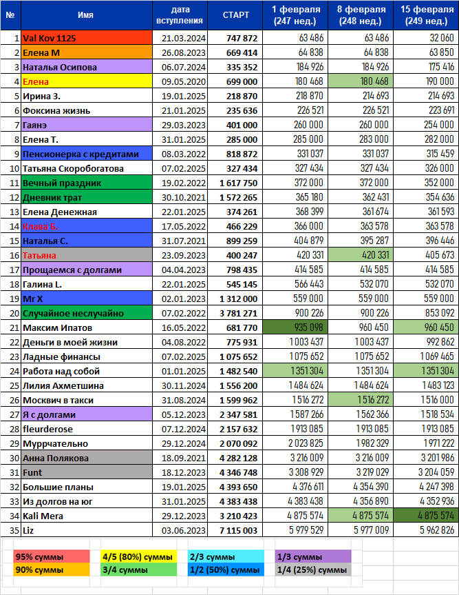 Всем привет! За последние несколько недель впервые никто не покинул нашу таблицу. Но похоже, это ненадолго! Но обо всём по порядку. И как всегда начнем с тройки лидеров по погашению сумм за неделю: Первое место: Большие планы - минус 106992р. Второе - у Случайное не случайно, погасившей 47135р. А на третьем месте Я с долгами с результатом минус 43832р. Поздравляем! А также я хочу отметить скромную номинацию "копейка рубль бережёт", в которую снова попала я, получив очередной кэшбэк по какой-то там карте. И мой долг уменьшился аж на 81 рубль! Но я не одна в этой номинации, со мной Москвич в такси, чей долг стал меньше на 272 рубля! Не менее интересно, как распределяются места по погашению долга в процентах от суммы: Первое место занимает Val Kov, погасивший почти половину оставшегося долга: минус 49,5%! С большим отрывом на втором месте участница Вечный праздник с результатом минус 5,38%. Замыкает тройку лидеров Случайное неслучайно, чей долг уменьшился на 5,24%. Поздравляем! Ну а измен