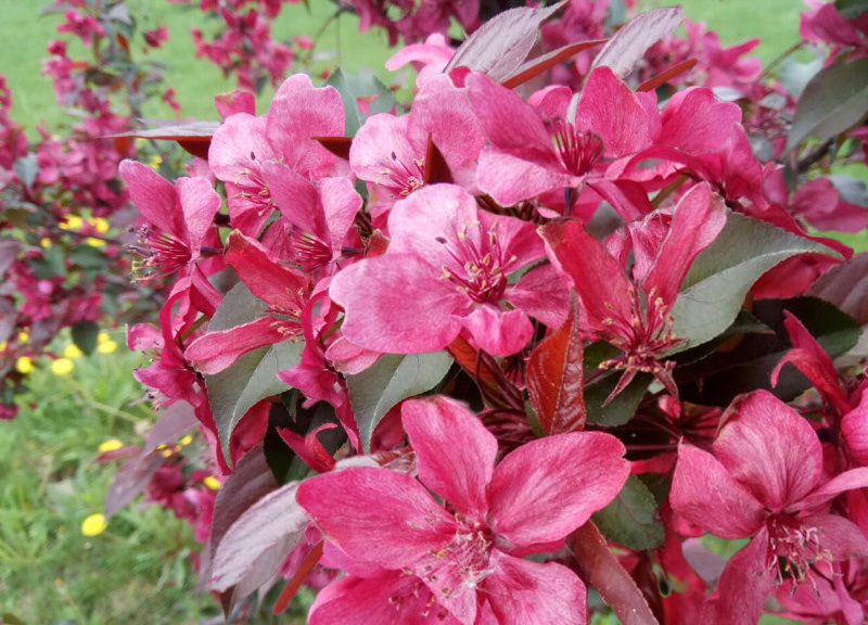 Яблоня Недзвецкого отлично смотрится на фоне газонов, хвойных культур, часто дизайнеры используют ее в качестве солитерного растения, отдавая пурпурной красавице главное место в саду.