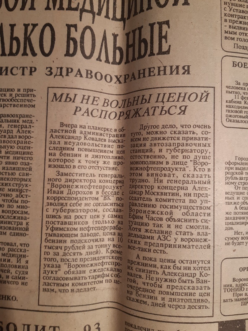 На прошлой неделе «Блокнот Воронеж» сообщал о повышении цен на все виды топлива. За литр дизеля придется отдать 65,85 рублей, что на 0,08 рублей больше по сравнению со старыми ценниками. Стоимость бензина АИ-92 выросла на 0,03 рублей (56,27 рублей), а АИ-95 – на 0,04 рублей (61,43 рублей). АИ-98 подорожал на 0,05 рублей (83,66 рублей). Увы, но новости о повышении цен на топливо стали для воронежцев уже обыденностью. Надо сказать, что такие тенденции начались по всей России практически сразу после развала Советского Союза. Чтобы убедиться в этом, достаточно посмотреть на публикации прессы начала 90-х годов. Например, 16 февраля 1993 года газета «Воронежский курьер» писала о совещании губернатора Александра Ковалева, где обсуждалось сильное повышение цен на бензин и дизель. Глава региона выражал свое неудовольствие этим обстоятельством. К тому же, чиновники повысили расценки, пользуясь отъездом Ковалева из Воронежа. В то время на местном топливном рынке существовал монополист. Это было г