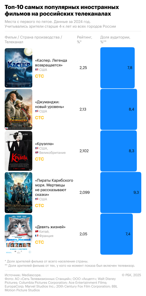 В результате самым популярным иностранным фильмом на телевидении в 2024 году стал «Каспер. Легенда возвращается», вышедший на СТС в марте (рейтинг — 2,2%, доля — 7,8%). Вторую строчку занял приключенческий фильм «Джуманджи: новый уровень» с Дуэйном Джонсоном в главной роли. Картина также вышла в марте на СТС и собрала рейтинг 2,1% и долю 8,4%. Замыкает тройку лидеров «Круэлла» с Эммой Стоун, вышедшая на СТС в феврале с рейтингом 2,1% и долей 8,3%. Кроме того, в топ-10 также попали три голливудских кинокомикса: «Вечные» (выходили на РЕН ТВ), «Мстители. Финал» (РЕН ТВ) и «Веном» (СТС). Для сравнения: в 2022 году весь рейтинг, помимо франшизы «Один дома», был представлен серией «Гарри Поттер», но после ухода киностудии Warner Bros. из России показывавший ее СТС потерял права на трансляцию этих фильмов.