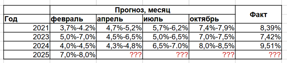 В пятницу, сразу после заседания совета директоров, я писал о новом среднесрочном прогнозе Банка России: Это первый прогноз в этом году. Впоследствии он будет уточняться в апреле, июле, октябре. Теперь я решил посмотреть насколько точными были прогнозы Банка России по инфляции на текущий год за последнее время. Для этого рассмотрю прогноз инфляции и ее факт за 2021, 2023, 2024 года. 2020 год опускаю из-за внешнего шока в виде пандемии, а 2021 из-за СВО. Цифры получились следующие: Наиболее точным он оказался в 2023 году - интервал 5.0%-7,0% при факте 7,42%. Превышения факта инфляции над верхней границей февральского прогноза составили: В этом году Банк России довольно резко поднял прогноз по инфляции до 7.0%-8.0%. Но скорее всего в этом интервале он не сможет ее удержать. Журналисты после резкого повышения прогноза пишут новости со следующими заголовками: Я бы уточнил: И об этом я писал еще в конце прошлого года: Скорее всего возврат к политике таргетирования инфляции будет происходи