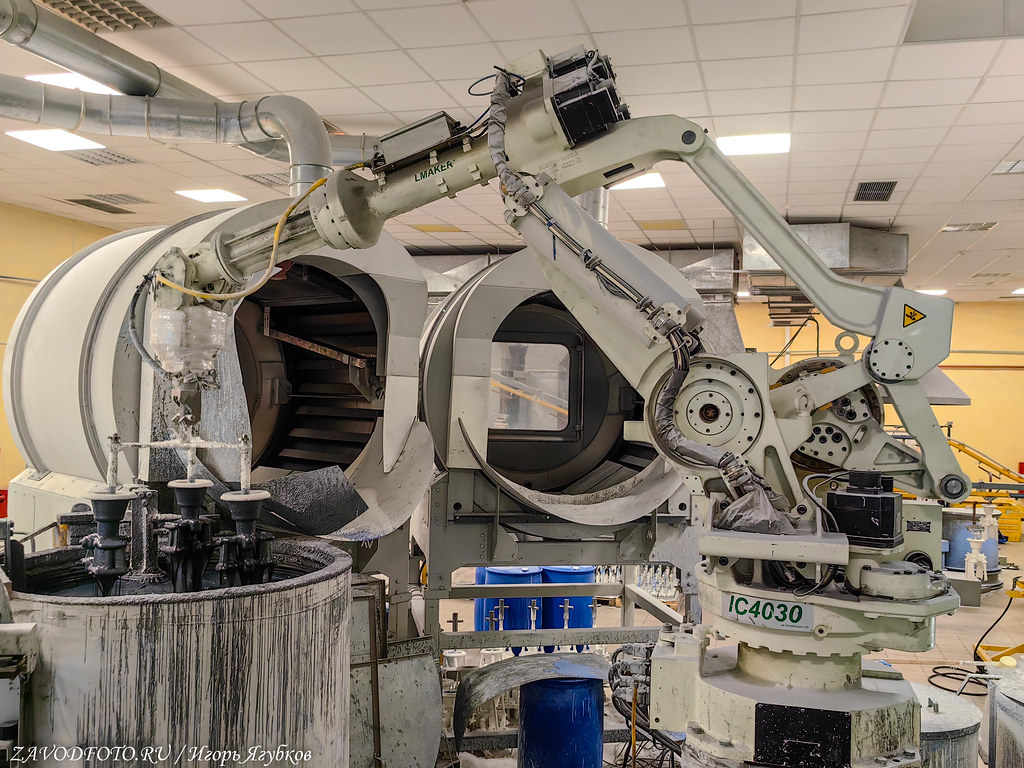 Изготовление керамических форм-оболочек производится последовательным (послойным) нанесением керамики на модельный блок с сушкой каждого слоя. На этом этапе роботы помогают. Что касается слоев, то их количество зависит от массогабаритных размеров отливки и параметров заливки жидким металлом.