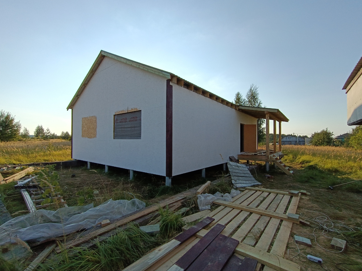 Всем привет, дорогие подписчики и гости канала. Статья будет посвящена тому, как и сколько можно сэкономить средств семейного бюджета при наличии времени и хоть немного, но правильно растущих рук из нужного места. Как мы уже писали в предыдущих статьях, мы выбрали способ строительства нашего дома с привлечением подрядчика на самую тяжёлую работу, в нашем случае – это фундамент и каркас под крышу. Дальнейшая работа планировалась быть выполнена своими силами, если это целесообразно по времени и финансам, а также, в некоторых случаях, свободного времени у наших помощников, например, с братом и мужем сестры мы обшили каркас гидроветрозащитой, смонтировали обрешётку и ОСП 160 м² за три дня. Возьмём рублей по 500 м², если нанять подрядчика, итого экономия 80000 р. Входную временную дверь б/у внедрили с помощью самостояногой установки, тут всё просто. Окна изначально думали тоже устанавливать сами, но стоимость работ по установке (10000 р.) и срочный выезд в командировку не оставили выбора,