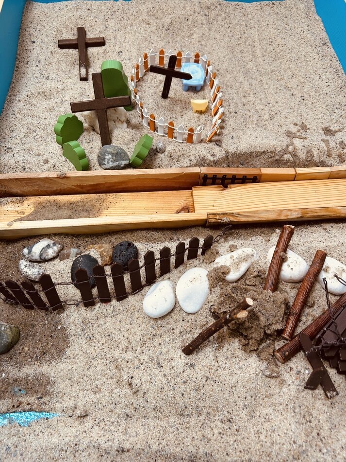 На фотографии работа ребенка на песочном поле: это событие, на котором он не присутствовал, так как родители не взяли с собой. В сознании мальчика дедушка продолжает жить полной жизнью: он здоров и активен.
