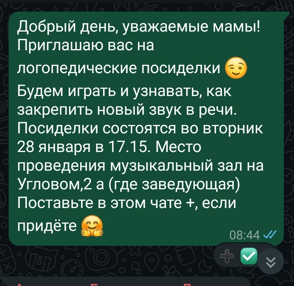 Итак, за неделю я написала в общей группе «Логопункта» приглашение для всех родителей и попросила поставить «+» всех, кто планирует прийти.