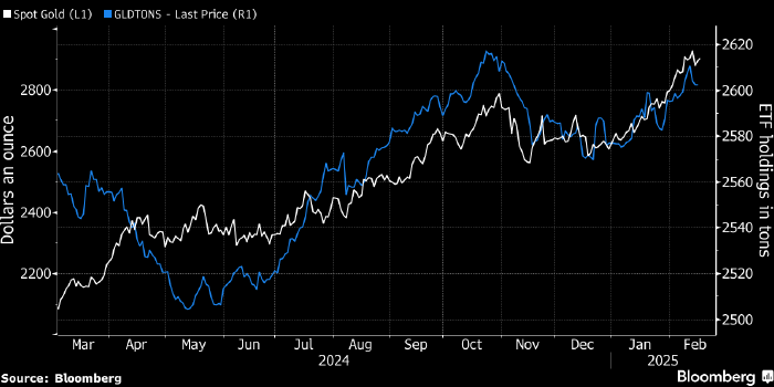 При этом золото может подскочить и до $3300 за унцию, если сохранится неопределенность относительно экономической политики США, предупреждают эксперты банка. Белым — цена золота в долларах за унцию (левая шкала), синим — объем драгметалла в «золотых» ETF в тоннах (правая шкала). Источник: Bloomberg Goldman Sachs повысил прогноз по цене золота на конец года до $3100 с $3000 за унцию. В банке полагают, что поддержку драгметаллу окажут спрос со стороны мировых ЦБ и приток капитала в «золотые» биржевые фонды (ETF). В этом году спрос мировых центробанков на золото может составить в среднем 50 тонн в месяц, что выше предыдущих ожиданий, пишут аналитики Goldman Sachs. Кроме того, по их мнению, золото может подскочить и до $3300 за унцию, если сохранится неопределенность относительно экономической политики США. Банк возобновляет рекомендацию по золоту на уровне «покупать», отмечая, что драгметалл выступает отличной страховкой на случай эскалации торговых конфликтов. «Вдобавок к этому, риски со