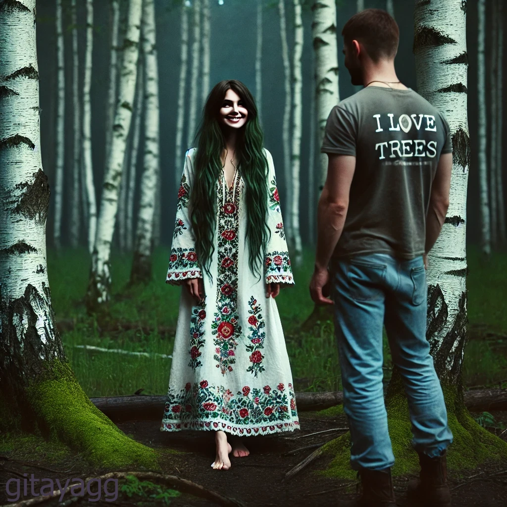 Стратополох обернулся, и увидел самую красивую девушку. Его нисколько не удивило, что прекрасная незнакомка была одета лишь в длинную рубаху, расшитую цветами. Густые зелёные волосы спускались до тонких изящных лодыжек. Лапушка стояла босиком на стылой земле, но, казалось, ей совершенно не холодно.