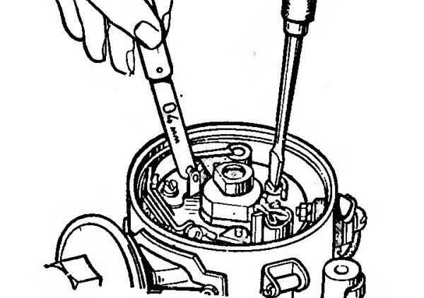 В момент полного размыкания контактов прерывателя зазор между ними должен оставаться в пределах 0,35-0,45 мм. Если зазор меньше нормальной величины, контакты будут быстро пригорать, при большой величине зазора искра будет слабая и не обеспечит воспламенения смеси на больших оборотах вала двигателя.Для регулировки зазора между контактами прерывателя снимают крышку распределителя, ротор и очищают контакты. Если контакты замаслены, их протирают чистой тряпкой, смоченной в бензине. Обгоревшие контакты зачищают надфилем или абразивной пластинкой так, чтобы их поверхности оставались параллельными. Затем контакты обдувают сжатым воздухом и протирают чистой тряпкой. После этого проворачивают коленчатый вал двигателя и устанавливают контакты так, чтобы они были полностью разомкнуты. Проверяют зазор щупом, который должен входить, не отжимая подвижный контакт.Если зазор между контактами велик или мал, необходимо его отрегулировать. Это достигается за счет перемещения неподвижного контакта относи