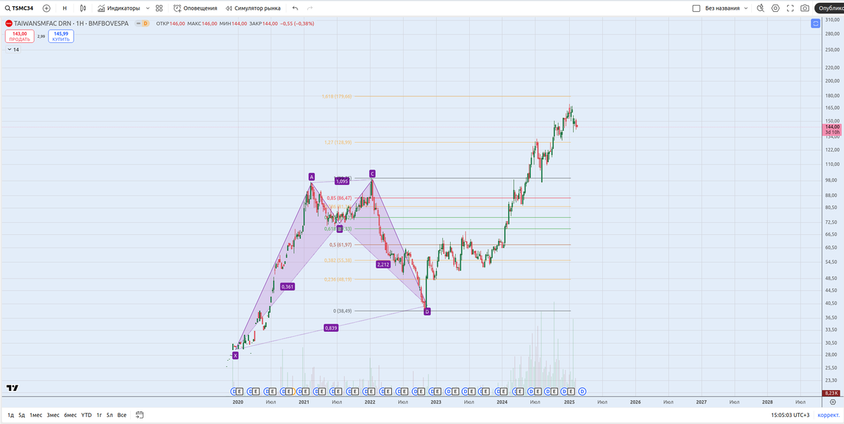 За два года с момента моего обзора от ноября 2022 года были закрыты все указанные цели. Наборка тогда до 41 доллара не получилась, т.к. дали спуск только до 0,236 фибы в районе 48 баксов. Итого средняя закупочная получилась на 52 USD. А в октябре 2024 была закрыта последняя моя цель на 137 USD. Итого профит составил около 160% от входной точки. На текущий момент мы можем закрыть ещё одну цель по 1,618 фибе на 180 USD. Однако потенциал для дальнейшего роста ещё имеется у актива. После пробоя 180 USD и закрепа над уровнем, откроется быстрая дорога к 465 USD (2,618 фиба). И есть ещё финальная мощная область 960 - 1200 USD. Поглядим. Все эти движения вверх можно ожидать внутри 2025 года. В конце года полностью фиксируем весь объём по TSMC.