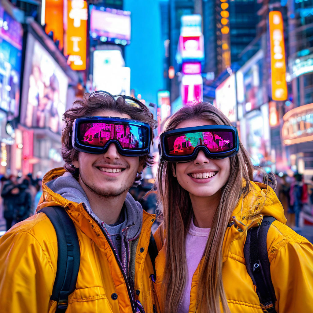 Все вывески, реклама, номера домов, дорожные знаки, даже декор – виртуальные. Можете навесить, кстати, виртуальный облик, макияж, татуировки например, или цвет волос, или свою страничку в соцсети над головой. Без очков все серое, отличающееся только архитектурой, и то не обязательно на все 100%, элементы, которые нельзя потрогать, например, высоко расположенные, можно тоже «нарисовать».