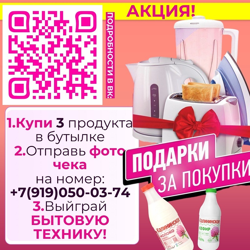 Любители натуральной молочной продукции могут выиграть ценные призы. Для этого им надо принять участие в акции «Подарки за покупки», которую проводит ЗАО «Калининское». Условия акции просты: нужно приобрести три продукта ЗАО «Калининское» в бутылках и отправить фото чека на номер 8-919-050-03-74. Победители получат в подарок бытовую технику. Впрочем, проигравших не будет, поскольку все участники приобретут полезные и натуральные молочные продукты. Напомним девиз ЗАО «Калининское»: «К здоровью – со вкусом!». Продукцию флагмана молочной промышленности Тверской области можно приобрести в магазинах торговых сетей «Пятерочка» и «Перекресток», в супермаркете «Кредо» и гипермаркете «Глобус». Участвуйте и выигрывайте с ЗАО «Калининское»! ________________ Реклама. Рекламодатель: ЗАО «Калининское». Erid: 2W5zFGAr92G