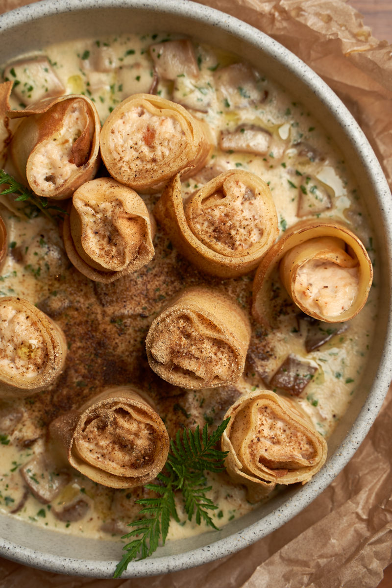 Блины с мясом угря и соусом из белых грибов
