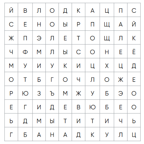 Польза выполнения когнитивных упражнений на внимание неоценима для поддержания ясности ума и повышения продуктивности в любом возрасте. Регулярные тренировки внимания улучшают концентрацию, снижают рассеянность и повышают способность быстро переключаться между задачами, что особенно важно в современном мире, наполненном отвлекающими факторами. Предлагаем вам выполнить несколько упражнений для тренировки внимания. В каких-то моментах они могут вам показаться детскими и совсем простыми, но мы не преследуем цели сильно вас загрузить :) Найдите в таблице все слова, состоящие из четырех букв. Сколько слов у вас получилось найти? В каждой строке найдите всего 1 животное, которое отличается от всех остальных. Внимательно рассмотрите картинку. Назовите все буквы, которые мы спрятали. Иногда ответ может быть не так очевиден. Пример: (Б,Г,П), (А,М,Л)...и.т.д. Посмотрите на домино с цифрами. Покажите одновременно на обеих руках соответствующее количество пальцев по следующему принципу: Скол