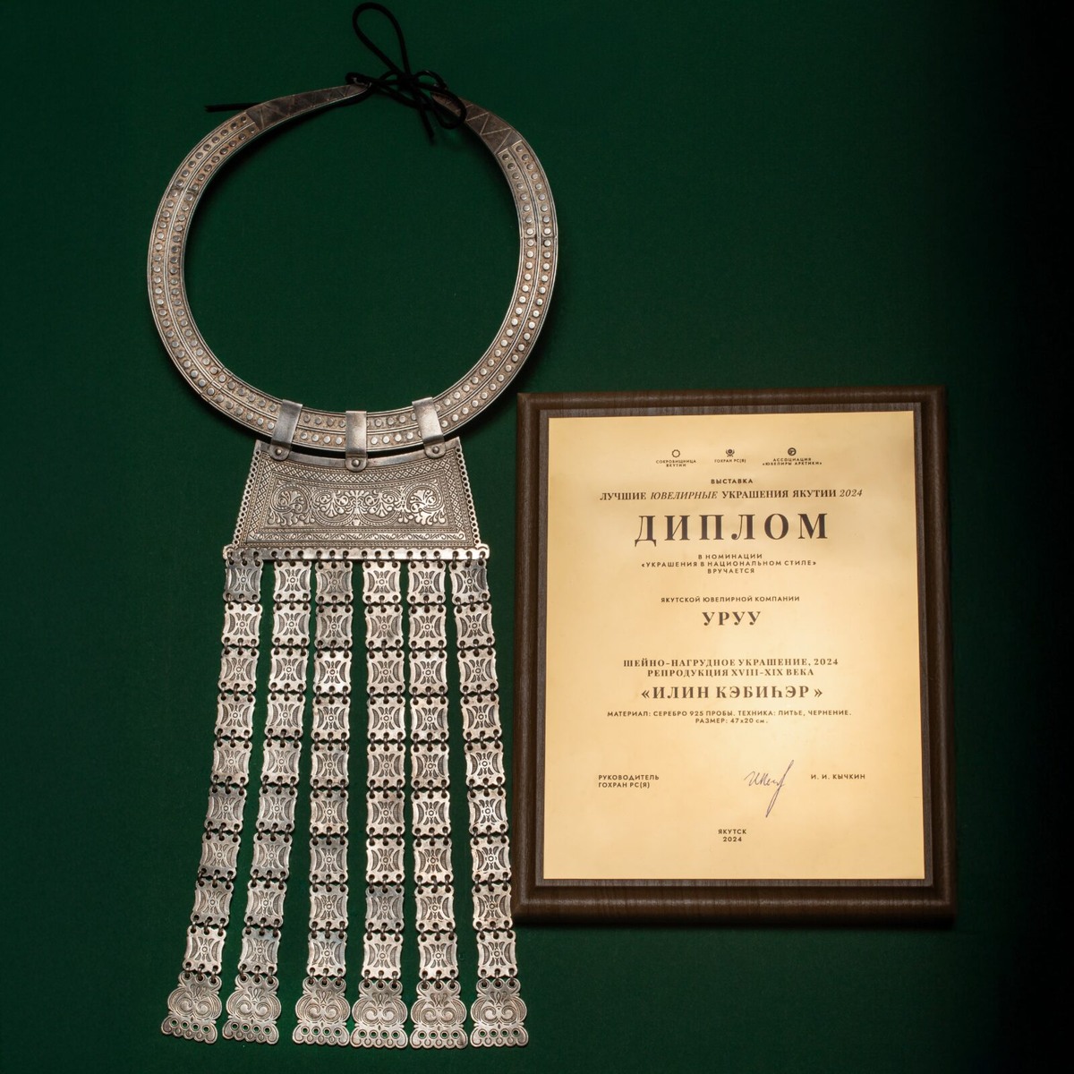 Победителем в номинации «Украшения в национальном стиле» стало шейно-нагрудное украшение, воспроизведённое ювелирами УРУУ. Украшение является репродукцией настоящего музейного экспоната начала XIX-XX веков. Изделие весом 576 гр. выполнено из серебра 925 пробы, эффект старины был создан методом чернения. Благодаря чему, украшение приобрело богатый и аутентичный вид.