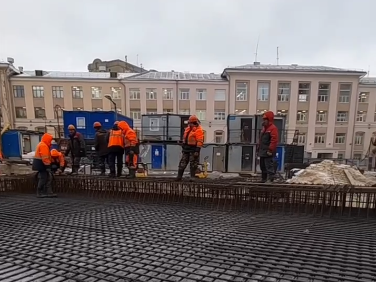 Сейчас рабочие готовят железобетонную плиту под кран, монолитное основание должно выдержать до 700 тонн. Размер плиты — 15,5 на 15,5 метров, для ее устройства необходимо 48 тонн металла и 168 кубометров бетона. В данный момент завершается этап вязки арматуры. Возведение основания под спецтехнику займет 10 дней.