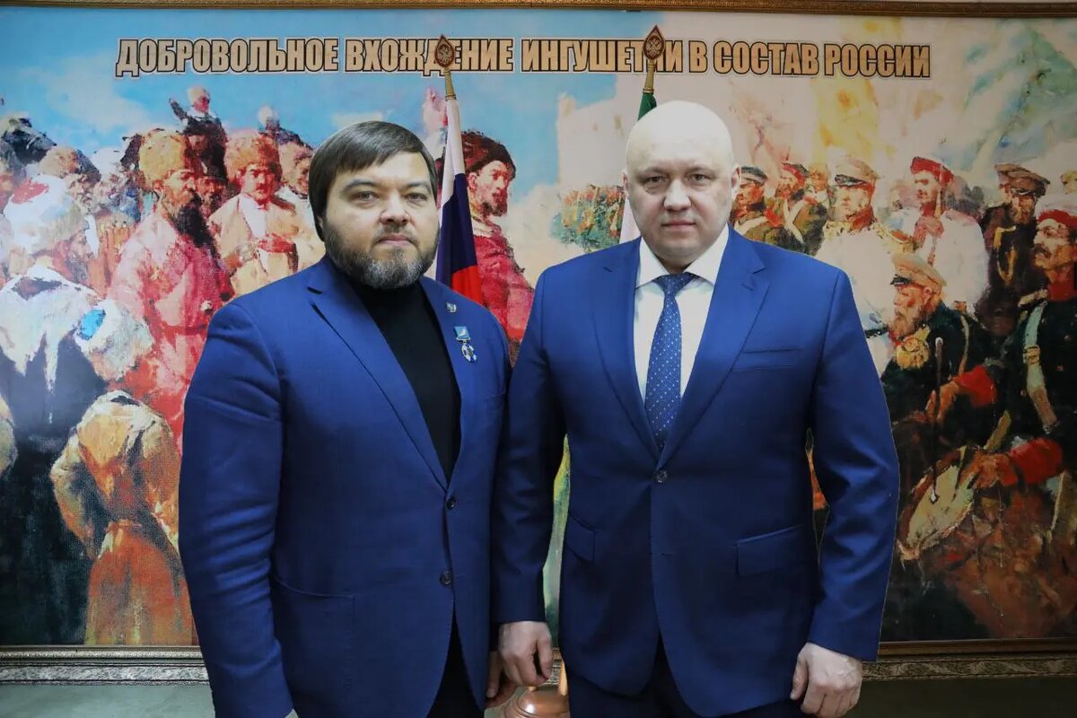 В Магасе прошла рабочая встреча руководителя регионального министерства внутренних дел Михаила Коробкина с помощником полномочного представителя Президента России в СКФО Айдамиром Валиевым, информировали газету «Ингушетия» в пресс-службе ведомства. По словам собеседника издания, стороны обсудили ключевые аспекты взаимодействия между правоохранительными органами республики и аппаратом полномочного представителя. Основное внимание было уделено вопросам укрепления межнационального и межконфессионального согласия в регионе, а также координации совместных усилий для поддержания стабильности и мира. В завершение мероприятия Михаил Коробкин отметил значительный личный вклад Айдамира Валиева в развитие эффективного сотрудничества между МВД республики и полпредством. В знак признания заслуг он вручил гостю нагрудный знак.