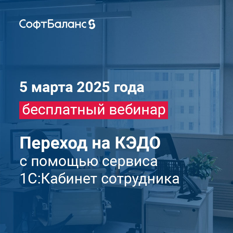 Группа компаний "СофтБаланс" - Центр компетенции по кадровому ЭДО - приглашает вас 5 марта на вебинар "Переход на КЭДО с помощью сервиса 1С:Кабинет сотрудника". На вебинаре вы узнаете: Кроме того, мы поделимся опытом перехода на КЭДО наших клиентов. Ведущая вебинара: Анастасия Лазарева, руководитель проектов ГК "СофтБаланс", знает все нюансы работы в сервисе "1С:Кабинет сотрудника", имеет опыт перевода компаний на КЭДО. Бонусы для участников: скидка 30% на услугу быстрого старта КЭДО до 15 апреля 2025 года, розыгрыш призов! Участие бесплатное, необходимо зарегистрироваться