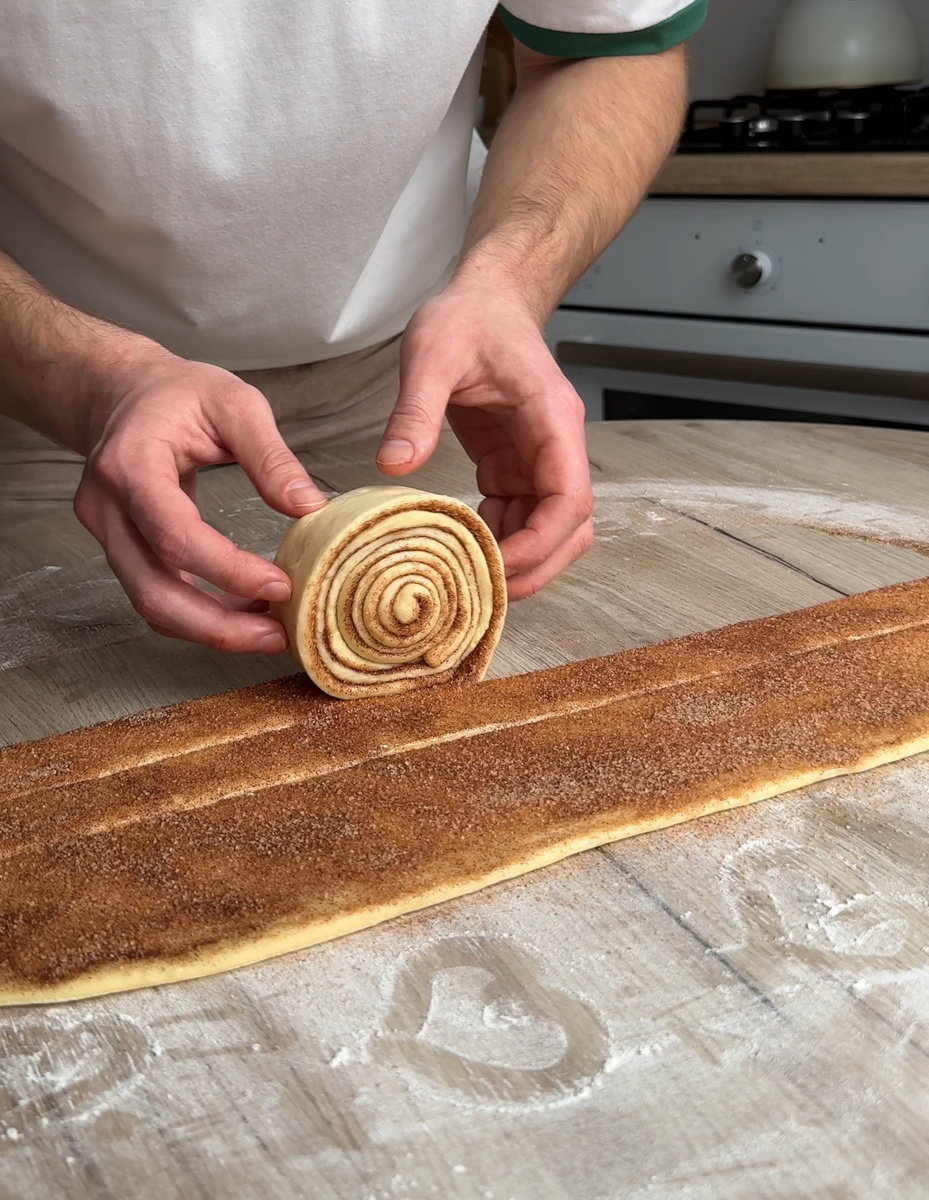 Молоко - 120 гр. Дрожжи (сухие) - 5 гр. Сахар - 60 гр. Мука - 300 гр. Яйца - 1 шт. Сливочное масло - 50 гр. Соль - щепотка Масло сливочное - 25 гр. Сахар - 70 гр. Корица - 6 гр. Сгущеное молоко - 100 гр. Сыр творожный - 100 гр. К теплому молоку добавляем дрожжи, 2 чайный ложки сахара (из общего количества) и 2 столовые ложки муки (тоже из общего количества). Оставляем опару в теплом месте подходить, она должна увеличиться в 2-3 раза. Яйца смешиваем с сахаром, сливочным маслом и опарой. Перемешиваем до однородности и всыпаем все сухие ингредиенты, вымешиваем тесто. Оно не должно прилипать к рукам и не быть забитым, поэтому количество муки может у вас немого отличаться. Убираем его в теплое место подходить. Готовое тесто рассказываем в 1 пласт, смазываем сливочным маслом и сахаром с корицей. Затем формируем пирог, как показано на видео и оставляем его подходить в теплом месте. Выпекаем 170-180 градусов до готовности теста (около 30-40 минут). Поливаем сверху кремом и нас