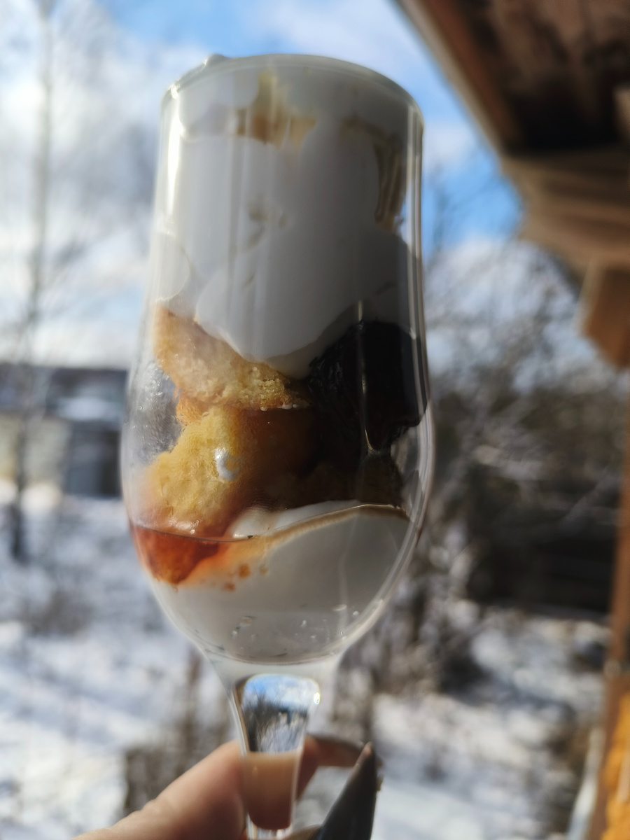 Я думаю, что все знают эти прекрасные десерты в бокалах — они называются трайфл. Так что я вам скорее просто напоминаю о том, что существует такое роскошество. В этот раз я сделала очень лениво и просто — из тех продуктов, которые можно купить в любом магазине, а то и завалялось дома.