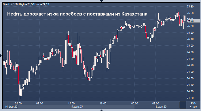 Нефть дорожает из-за перебоев с поставками из Казахстана График нефти марки Brent интервалами в 15 минут Цены на нефть марки Brent во вторник продолжили рост, который начался на предыдущей сессии. Причиной роста стала атака украинских беспилотников на нефтепровод в России, что привело к сокращению поставок из Казахстана. Однако рост цен был ограничен перспективой увеличения поставок в ближайшее время. Фьючерсы на нефть марки Brent выросли на 23 цента, или на 0,3%, до 75,45 доллара за баррель по состоянию на 07:58 по Гринвичу. Фьючерсы на американскую нефть марки West Texas Intermediate выросли на 75 центов по сравнению с пятничным закрытием на уровне 71,49 доллара за баррель. В понедельник не было расчётов по WTI из-за праздника в честь Дня президентов США. «Главной темой, определяющей цены на нефть в последнее время, были ожидания поставок. На фоне слабых цен за последние недели новости об атаке беспилотника на экспортный трубопровод Казахстана в России стали причиной ослабления некот