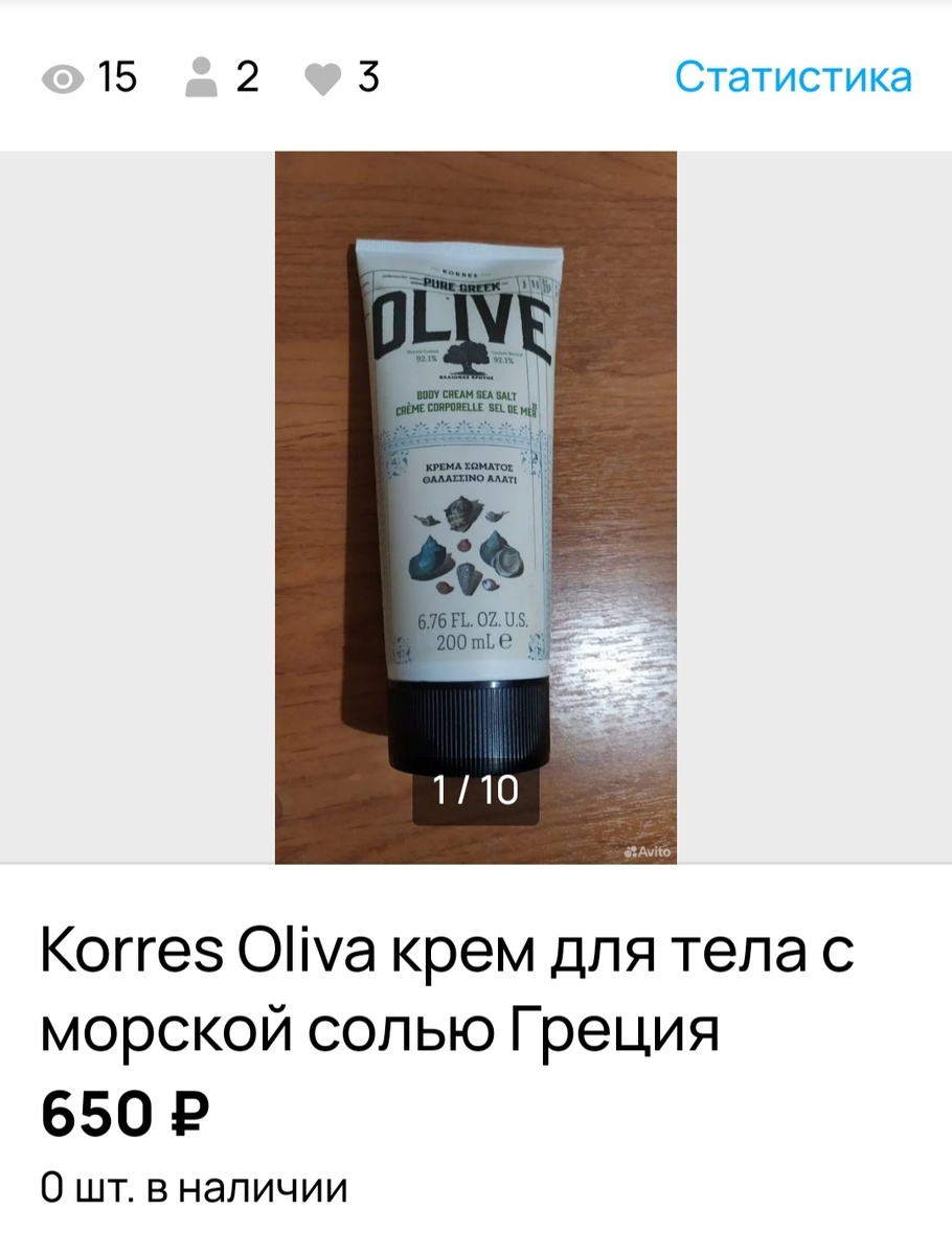 Доброго здоровья читающим. Продан крем для тела. Крем для тела Korres Oliva , с морской солью, 200 мл., новый, не открывался, срок годности до 08.2025 года. На упаковке указано , что сделан в Греции. Выставила отдельным лотом. Ажиотажа не было, хотя цена очень бюджетная. Просмотров пятнадцать, в избранном у трёх. Заказали через две недели после опубликования объявления. Быстрая продажа.