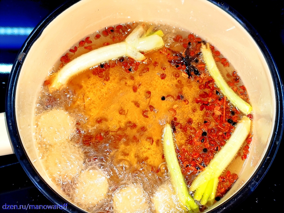 Сегодня будем делать острое и ароматное масло, без которого невозможно представить сычуаньскую кухню. Впрочем, такое масло используют в блюдах и других стран Юго-Восточной Азии (как вы, наверное, поняли, вскоре я что-то из этих блюд приготовлю). Готовится это масло быстро, из экзотических ингредиентов присутствует только сычуаньский перец, но его без проблем можно купить на маркетплейсах (я, к примеру, брал на трёхатомарнокислородном). Ингредиенты: Заливаем масло в подходящую кастрюльку, ставим на сильный огонь и доводим почти до кипения. Добавляем лук, имбирь, сычуаньский перец и бадьян. Убавляем огонь до среднего и готовим в течение минут десяти, изредка помешивая, пока лук с имбирем не подрумянятся. Снимаем кастрюльку с огня и переливаем масло в другую кастрюльку через сито. Кастрюльку с маслом возвращаем на средний огонь и добавляем семена кунжута. Готовим, пока кунжут слегка не поменяет цвет. Снимаем кастрюльку с огня и даем маслу слегка остыть (минут 10-15). Добавляем молотый чил