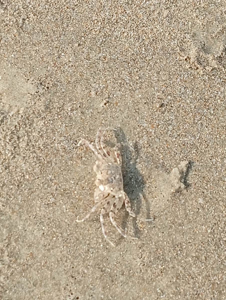 Сегодня на прогулке удалось сфотографировать убегавшего по песку краба. Обычно они бегают очень быстро и ныряют в песок, где они вырыли норы. Но в этот раз я закрыл нору ногой и ему не удалось удрать. После чего он замер и мне удалось сфоткать его. Правда он был маленький.