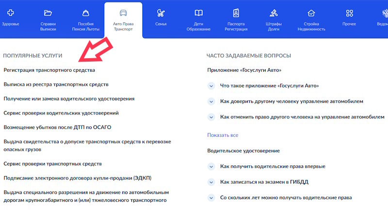 После входа в личный кабинет находим вкладку «Авто Права Транспорт», где выбираем «Регистрация транспортного средства.