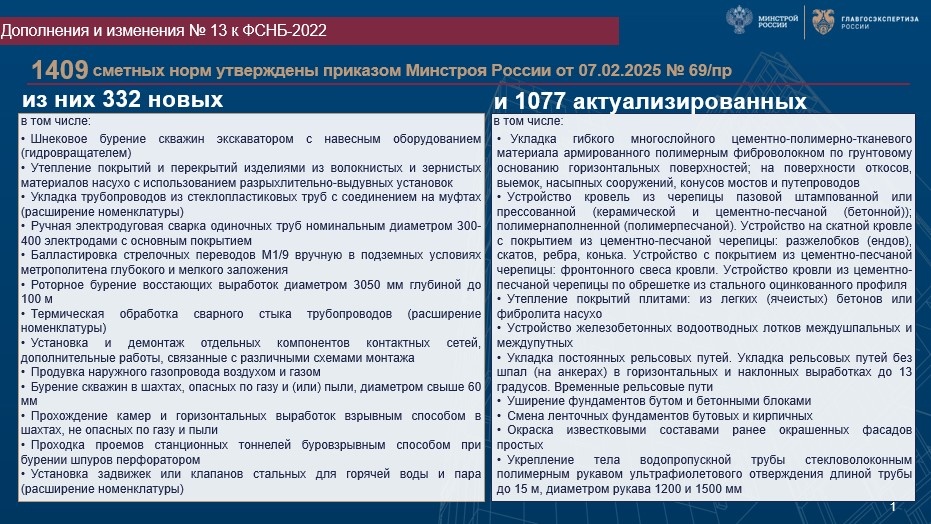В состав 13-ых изменений и дополнений в федеральную сметно-нормативную базу наряду с проектами других федеральных ведомств и компаний-инициаторов включено 35 сметных норм, которые разработала Главгосэкспертиза России. Их утвердил Минстрой России приказом № 69/пр от 7 февраля 2025 года. Наши эксперты более подробно рассказали о наиболее значимых из последних разработок для сметного нормирования в строительстве.