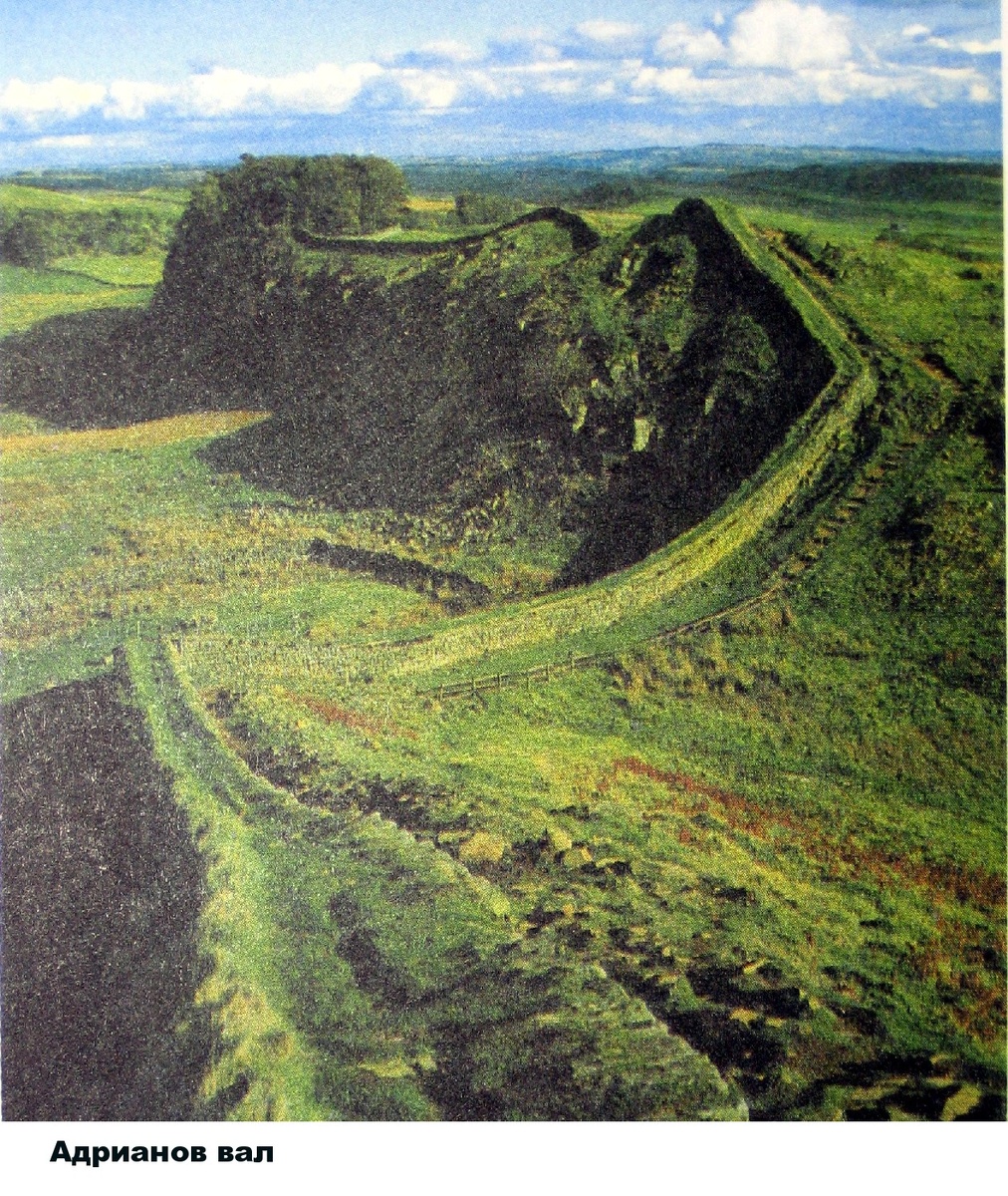 С 117 по 138 г. н.э. императором Рима был Адриан. Император Адриан обессмертил своё имя, организовав постройку оборонительной земляной насыпи между Англией и Шотландией длиной 120 км. ("Адрианов вал"). Здесь приводится фотография этого сооружения.