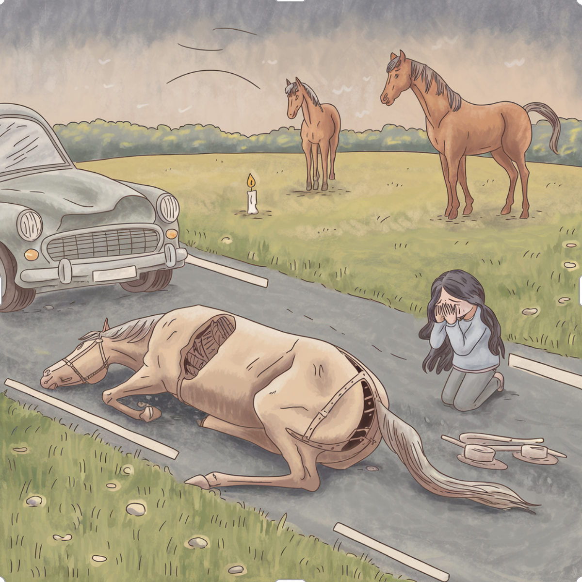 Полный текст новости: «Жители подмосковной деревни жалуются на табуны беглых лошадей, которые 10 лет носятся по дорогам и гибнут под колесами машин Подмосковная деревня Картино страдает от свободно гуляющих по городу табунов лошадей из частной конюшни. Как рассказала Readovka местная жительница, это продолжается уже 10 лет — кони и кобылы носятся по дорогам и ходят где попало в поисках еды. На днях одна из лошадей попала в ДТП с автомобилем — машине в хлам разворотило передний бампер. После того, как животное в муках скончалось посреди дороги, его тушу оттащили на обочину. За рулем авто была беременная женщина — после новых жалоб представители Общественной палаты Ленинского горокруга и территориального отдела рекомендовали хо
