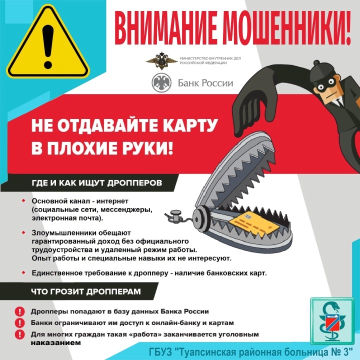 Это сообщники злоумышленников, которые выводят и обналичивают похищенные у граждан деньги. ЧЕМ ЗАНИМАЮТСЯ ДРОППЕРЫ Получают на свои карты деньги от незнакомцев и передают их другим лицам наличными или переводом, либо предоставляют злоумышленникам банковские карты или доступ к онлайн-банку, а также принимают наличные деньги от неизвестных людей, вносят их на свои счета для последующего перевода. ГДЕ И КАК ИЩУТ ДРОППЕРОВ Основной канал - интернет (социальные сети, мессенджеры, электронная почта). Злоумышленники обещают гарантированный доход без официального трудоустройства и удаленный режим работы. Опыт работы и специальные навыки их не интересуют. Единственное требование к дропперу - наличие банковских карт. ЧТО ГРОЗИТ ДРОППЕРАМ Дропперы попадают в базу данных Банка России, после чего банки ограничивают им доступ к онлайн-банку и картам. Для многих граждан такая «работа» заканчивается уголовным наказанием. БЕРЕГИТЕ БАНКОВСКИЕ КАРТЫ! НЕ ОТДАВАЙТЕ ИХ В ПЛОХИЕ РУКИ!
