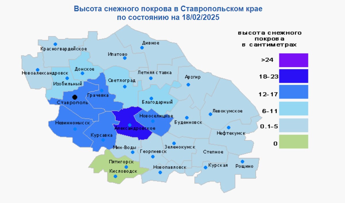 Высота снежного покрова в Александровском округе Ставрополья достигла 18-23 см. Это следует из данных, представленных на сайте краевого гидрометцентра. Снега выпало немало и в других местах. Например, образовались сугробы высотой: 12-17 см — в Ставрополе, Невинномысске, сёлах Курсавка, Грачёвка и Новоселицкое;6-11 см — в Благодарном, Светлограде, Изобильном, селе Донском;0,1-5 см — в остальных территориях, за исключением Пятигорска и Кисловодска (0). Отмечается, что осадки в регионе продолжатся. В ближайшие два дня местами возможен сильный снег, температура воздуха днём составит -4...-9 градусов, а ночью будет доходить до -15 градусов.