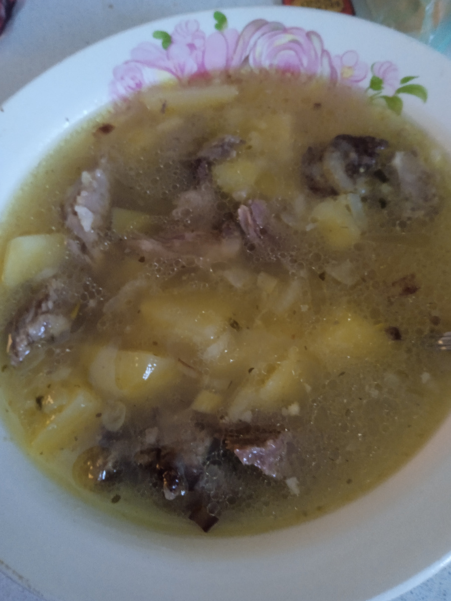 Бульон процедить дать закипеть, в кипящий бульон спускаем картофель, рис. Солим перчим, добавляем лавровый лист, по желанию зелень. Лук обжариваем до золотистой корочки, и добавляем в суп. Варим до готовности 15-20 мин. При подаче можно посыпать свежей, мелко порубленной зеленью.