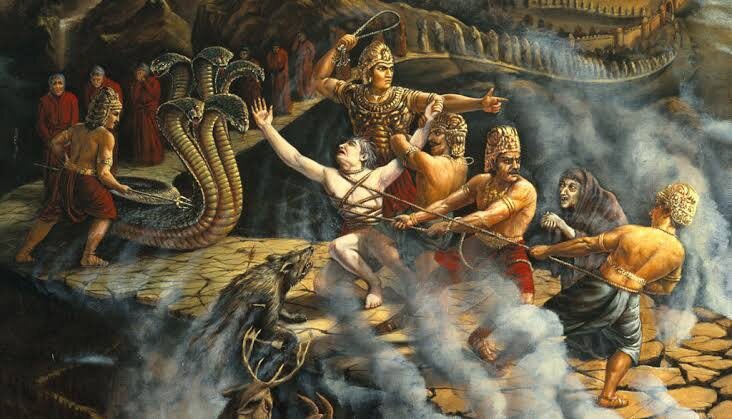 Яма (он же Ямарадж, Дхармарадж) - это полубог, который уполномочен Всевышним вершить над грешниками правосудие. Когда душа расстаётся с бренным телом, слуги Ямы (ямадуты) тащат её в судилище своего господина, чтобы тот решил, в какой ад и на какой срок душа отправится отбывать наказание. А помогает Ямараджу с этим делом его "секретарь" Читрагупта.