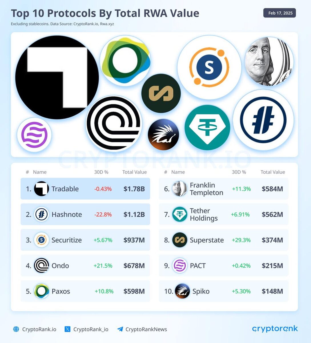 Токенизация реальных активов (RWA) продолжает набирать популярность в мире блокчейна, предоставляя новые возможности для инвесторов и улучшая ликвидность различных активов. Ниже представлен список топ-10 протоколов по общей стоимости токенизированных RWA, а также подробности о токенизации частных кредитов и недавних трендах на рынке. Этот протокол предоставляет платформу для токенизации различных активов, включая финансовые инструменты и недвижимость. Tradable активно работает над улучшением доступа к токенизированным активам. Протокол, который фокусируется на упрощении процесса токенизации и управления активами, позволяя пользователям легко создавать и торговать токенами. Один из лидеров в области токенизации, Securitize предлагает комплексные решения для выпуска и управления токенизированными активами, включая соблюдение нормативных требований. Этот протокол активно работает с частными кредитами и другими финансовыми инструментами. В последние 30 дней наблюдается рост общей стоимости