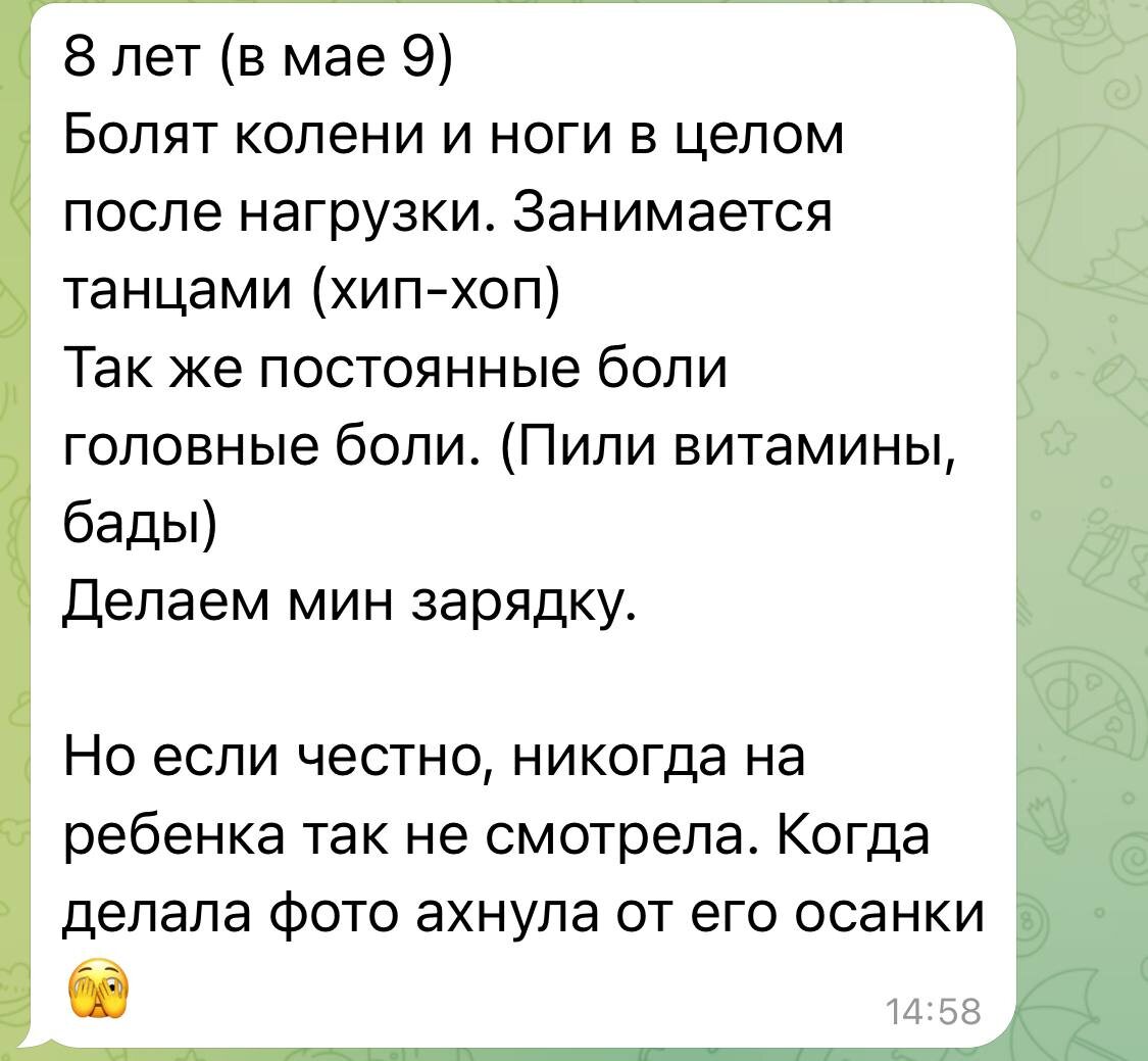 Слова, которые написала мама «когда делала фото ахнула от осанки» - я слышу регулярно. Поэтому смотрите, а лучше фотографируйте и понимайте, что диагностика и профилактика лучшее! Правда как правило в столь юном возрасте уже есть, что исправлять. 📍Что волнует маму (развернуто на фото): мальчику 8 лет, боль в коленях и в ногах, головные боли. 📍Общий Анализ: Две ключевые точки напряжения - голова и крестец. Форма тела сжатая. И хотя визуально кажется, что все достаточно приемлемо, проблемы достаточно выраженные. 📍Расширенный анализ: Выраженная сутулость, слабая поясница, чрезмерно выраженный угол наклона головы вперед, присутствует разворот тела вправо вперед, а также множественные сломы линий - линия глаз и ушей уходит влево вниз, при этом линия плеч уходит влево вверх. Угол коленей и стоп разнится, а также больше нормы, вероятнее всего присутствует плоскостопие. Астигматизм - как отягащающий, также и начальный фактор (сделаю на тему зрения и осанки отдельную тему, но