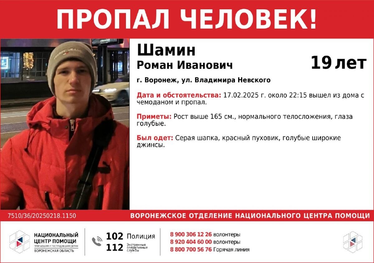 В Воронеже пропал 19-летний молодой человек. Ориентировку распространили волонтеры Национального центра помощи детям. Роман Шамин вышел из дома в понедельник, 17 февраля, примерно в 22:15 часов. Юноша отправился в неизвестном направлении с чемоданом и до сих пор не вернулся домой. В последний раз его видели на улице Владимира Невского. Рост Романа - выше 165 сантиметров. У парня голубые глаза и нормальное телосложение. Когда юноша выходил из дома, на нем были серая шапка, красный пуховик и широкие голубые джинсы. Если вам известна информация о возможном местонахождении Романа - просьба сообщить в полицию по номеру 112 или позвонить волонтерам, телефоны которых указаны в ориентировке.