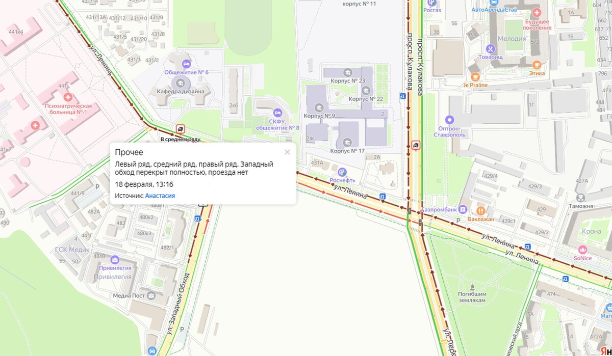 В краевой столице в районе Ботанического сада столкнулись несколько машин. Авария произошла около круга, соединяющего улицу Ленина и Западный обход. Из-за ДТП перекрыт проезд в сторону Юго-Запада города. К слову, по данным сервиса «Яндекс.Карты» в данный момент пробки в городе достигают 8 баллов.